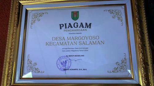 MARGOYOSO - Kepala Desa Margoyoso Adi Daya Perdana mendapatkan penghargaan Rintisan Desa Anti Korupsi pada November 2024 di acara Larwasda (Gelar Pengawasan Daerah).